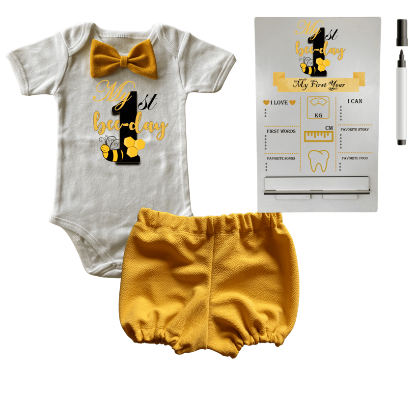 1st Birthday | Bubble pants & Bowtie vest | Milestone sign | Mustard | 1st Bee Day