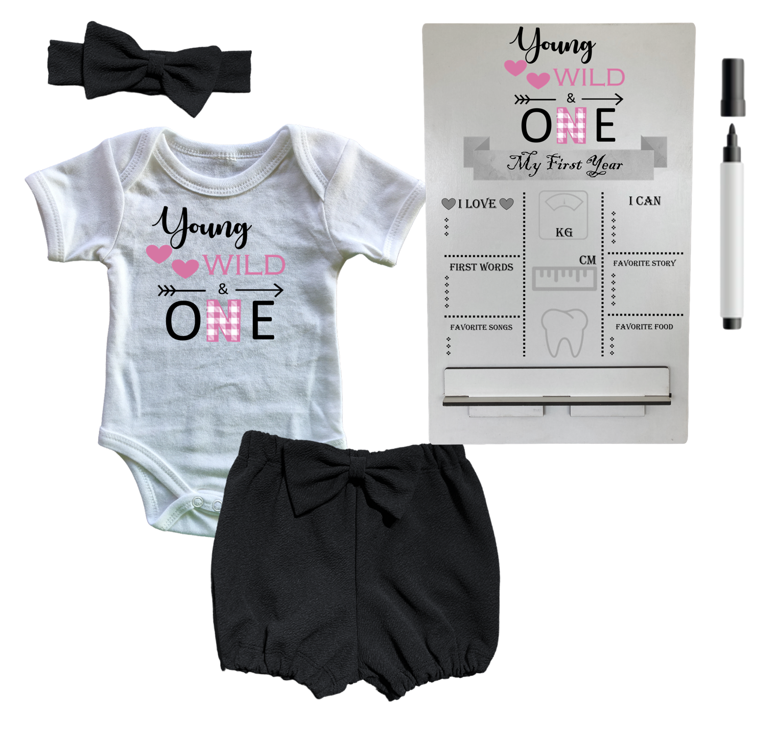 1st Birthday | Bubble Shorts, vest & Headband | Milestone sign | Black | Young, Wild & One