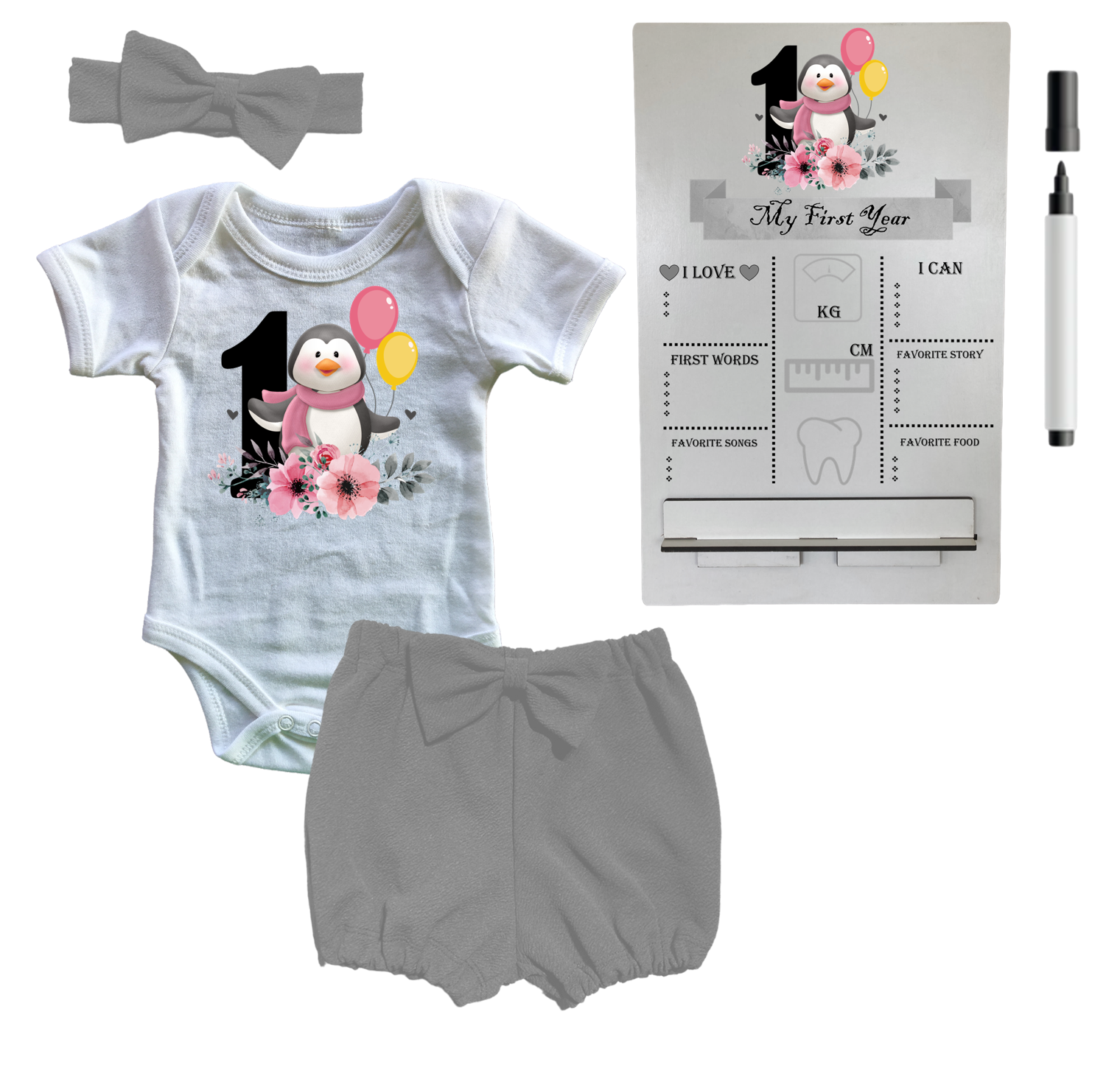 1st Birthday | Bubble Shorts, vest & Headband | Milestone sign | Grey | Penguin 1st