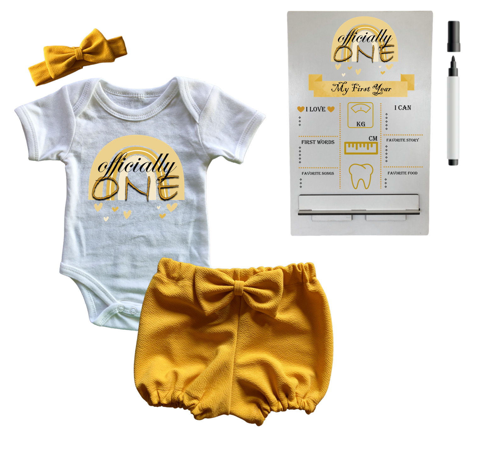 1st Birthday | Bubble Shorts, vest & Headband | Milestone sign | Mustard | Officially One