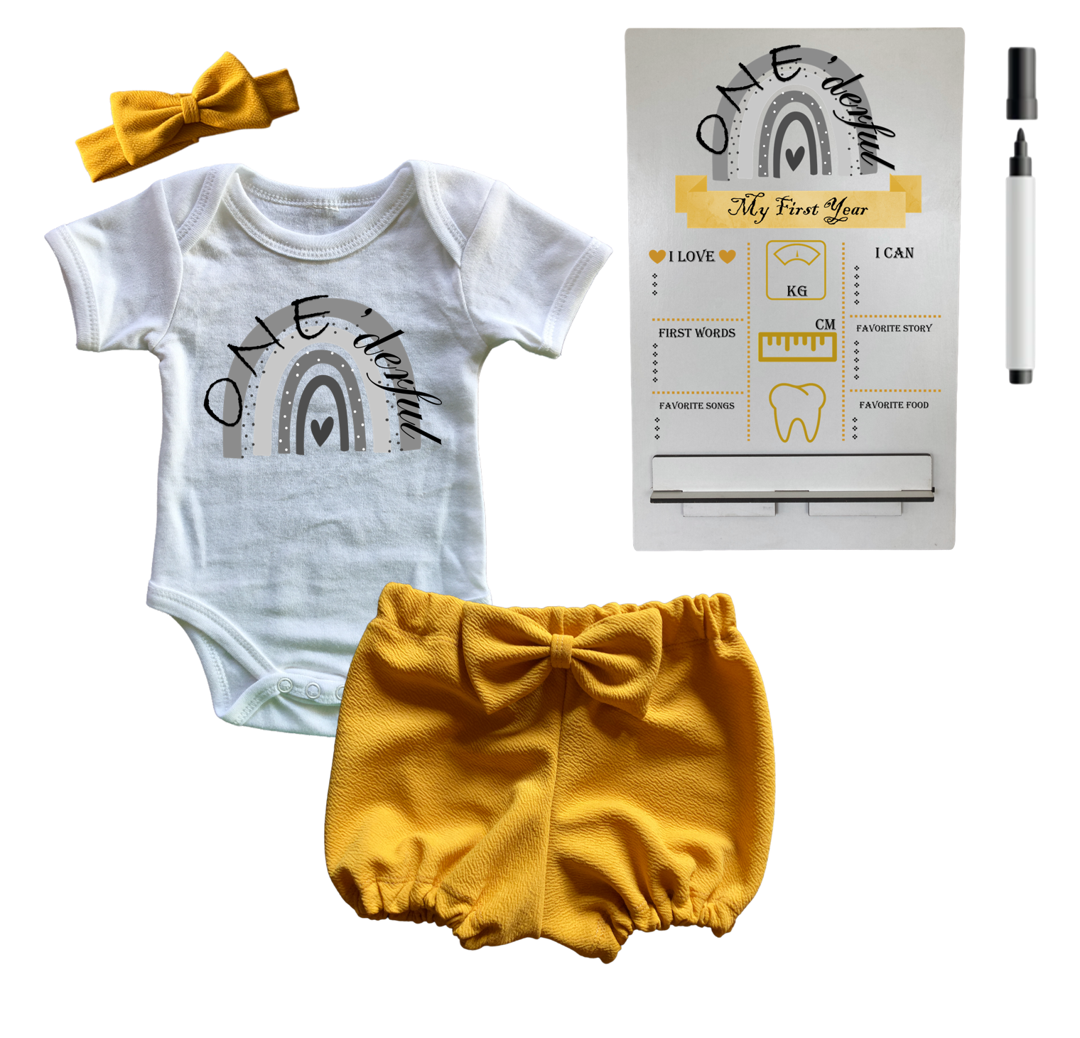 1st Birthday | Bubble Shorts, vest & Headband | Milestone sign | Mustard | Rainbow One’derful
