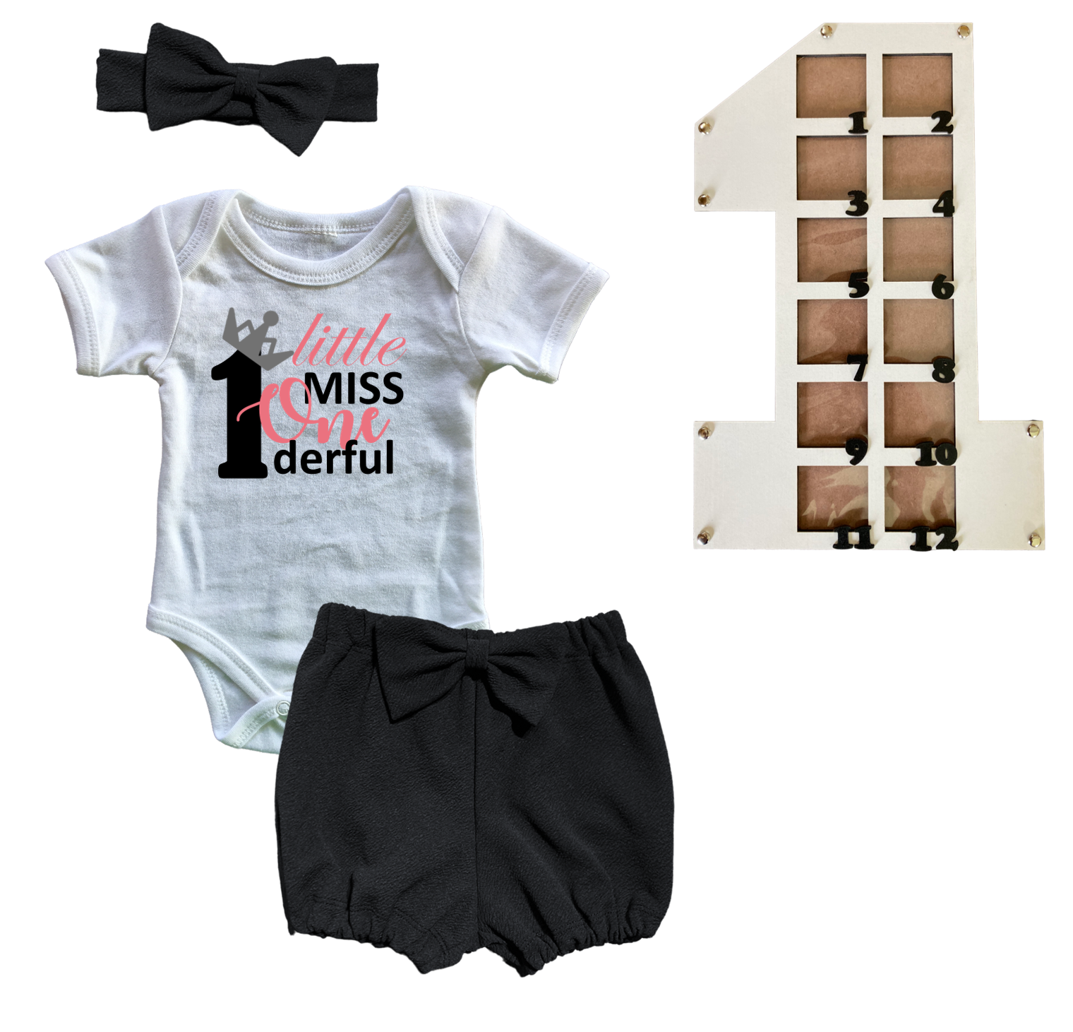 1st Birthday | Bubble Shorts, vest & Headband | Photo Frame | Black | Little Miss One’derful Pink Crown