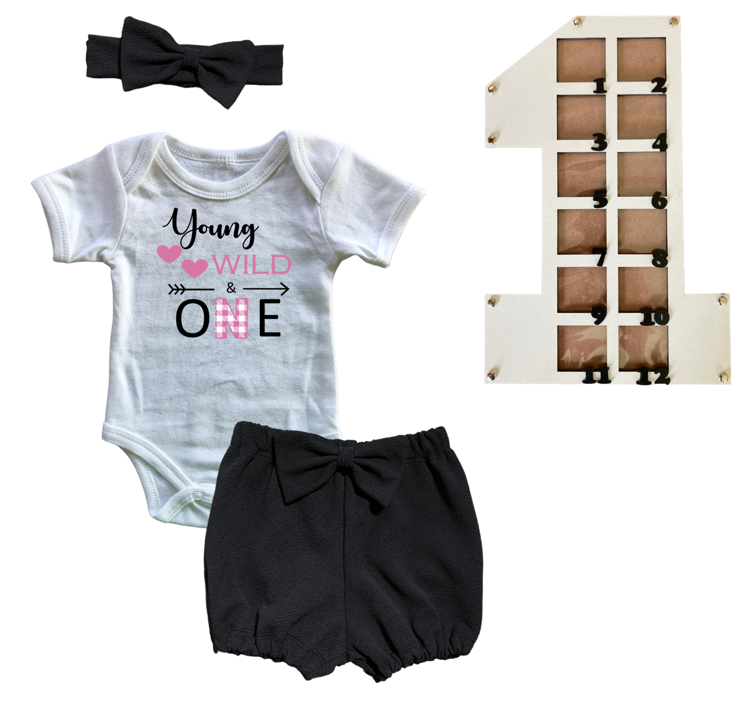 1st Birthday | Bubble Shorts, vest & Headband | Photo Frame | Black | Young, Wild & One