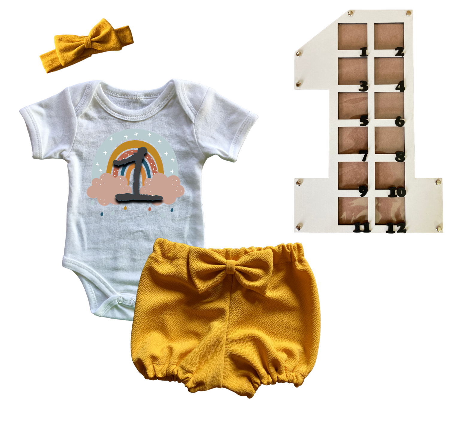1st Birthday | Bubble Shorts, vest & Headband | Photo Frame | Mustard | Rainbow Colorful 1