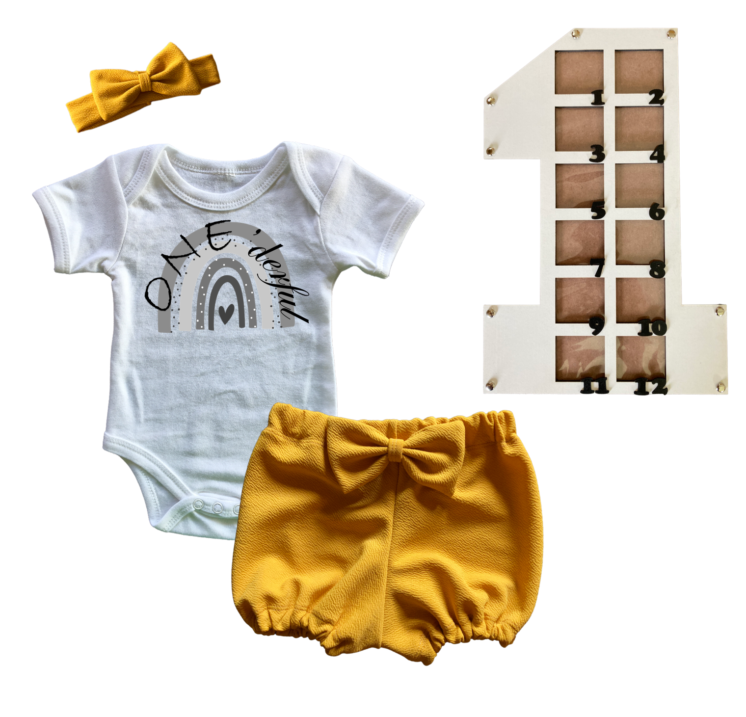 1st Birthday | Bubble Shorts, vest & Headband | Photo Frame | Mustard | Rainbow One’derful