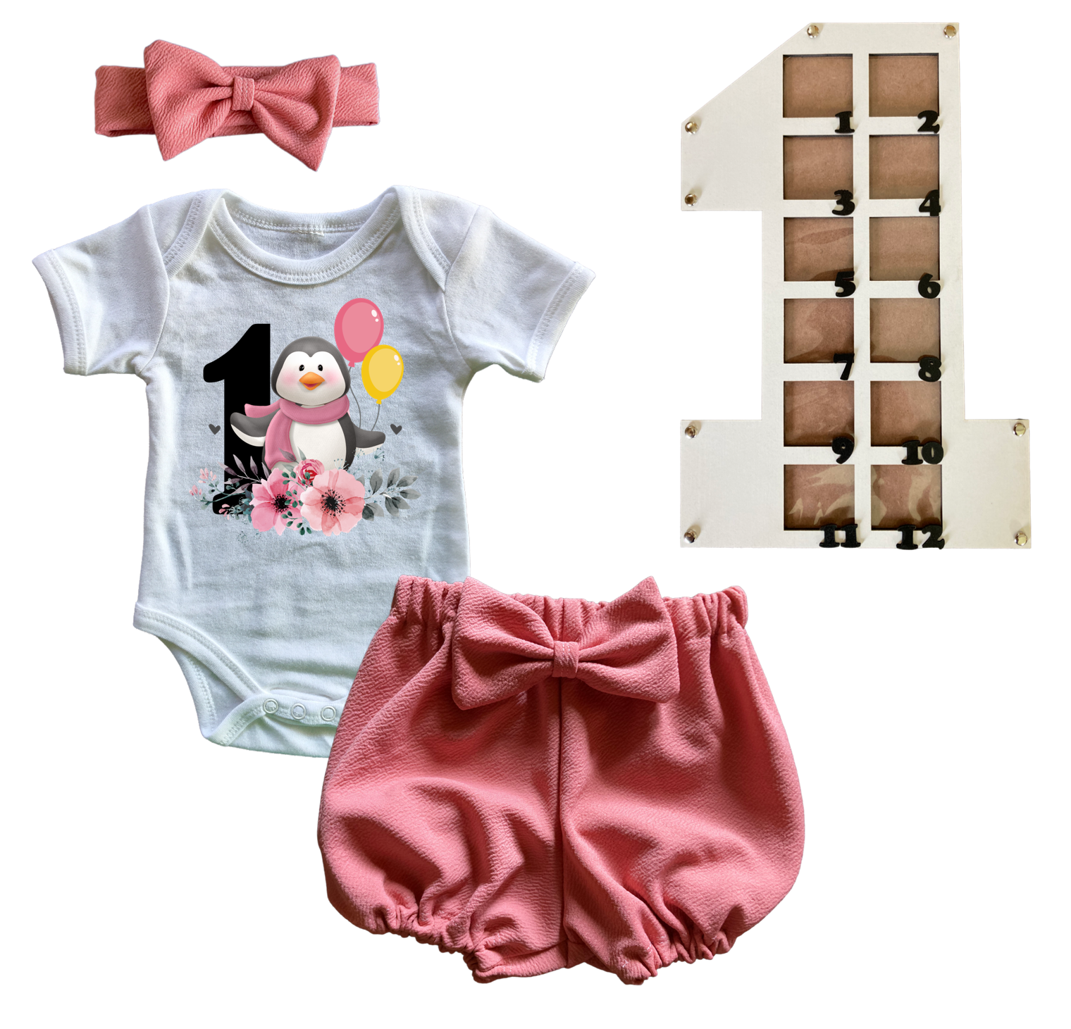 1st Birthday | Bubble Shorts, vest & Headband | Photo Frame | Pink | Penguin 1st