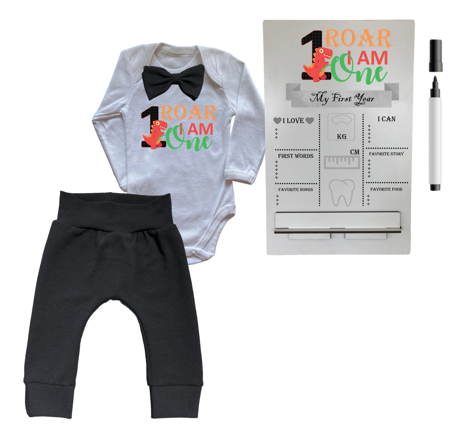 1st Birthday | Long sleeve pants & Bowtie vest | Milestone Sign | Black | Roar, I am One