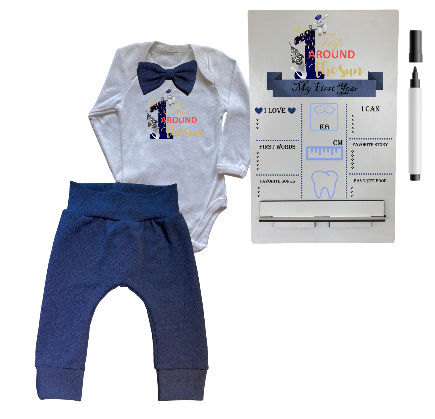 1st Birthday | Long sleeve pants & Bowtie vest | Milestone Sign | Navy | 1st Trip around the sun