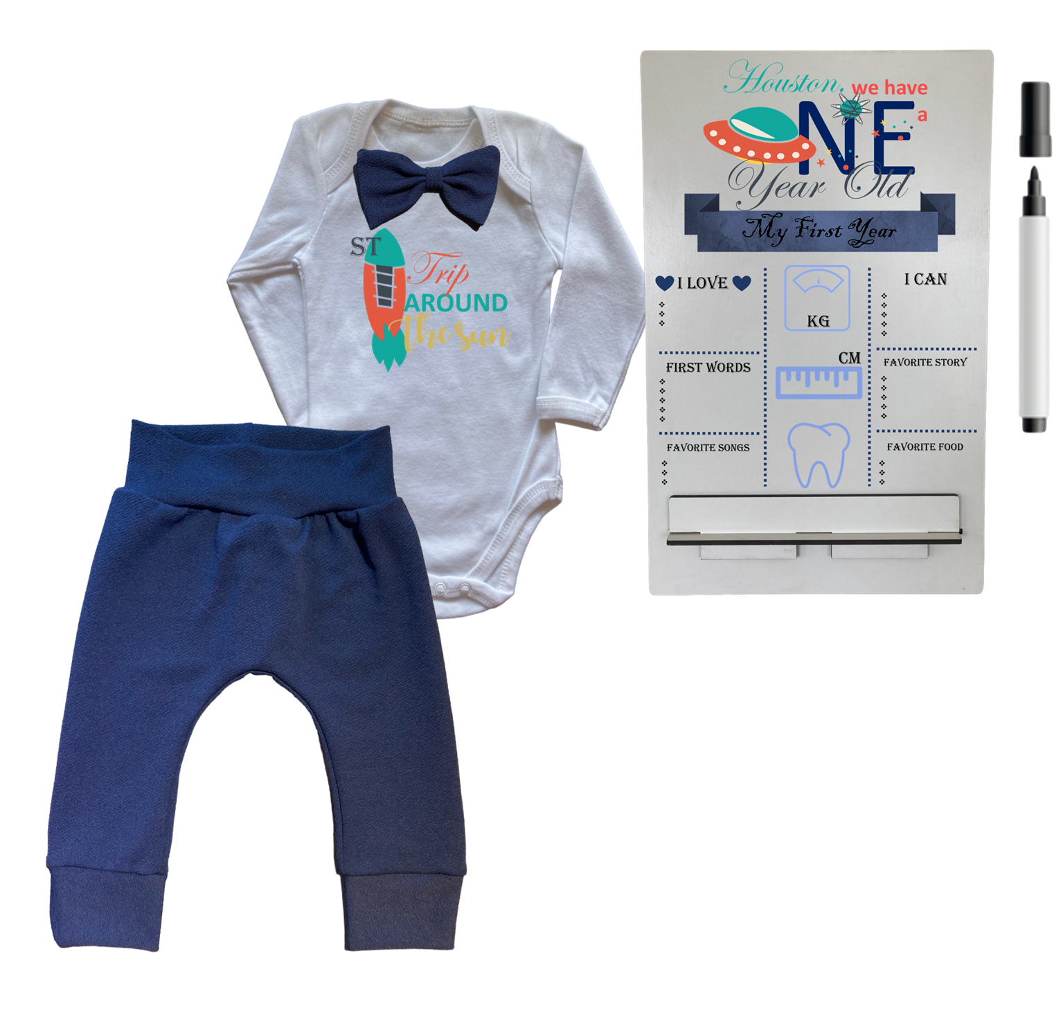 1st Birthday | Long sleeve pants & Bowtie vest | Milestone Sign | Navy | 1st Trip around the sun