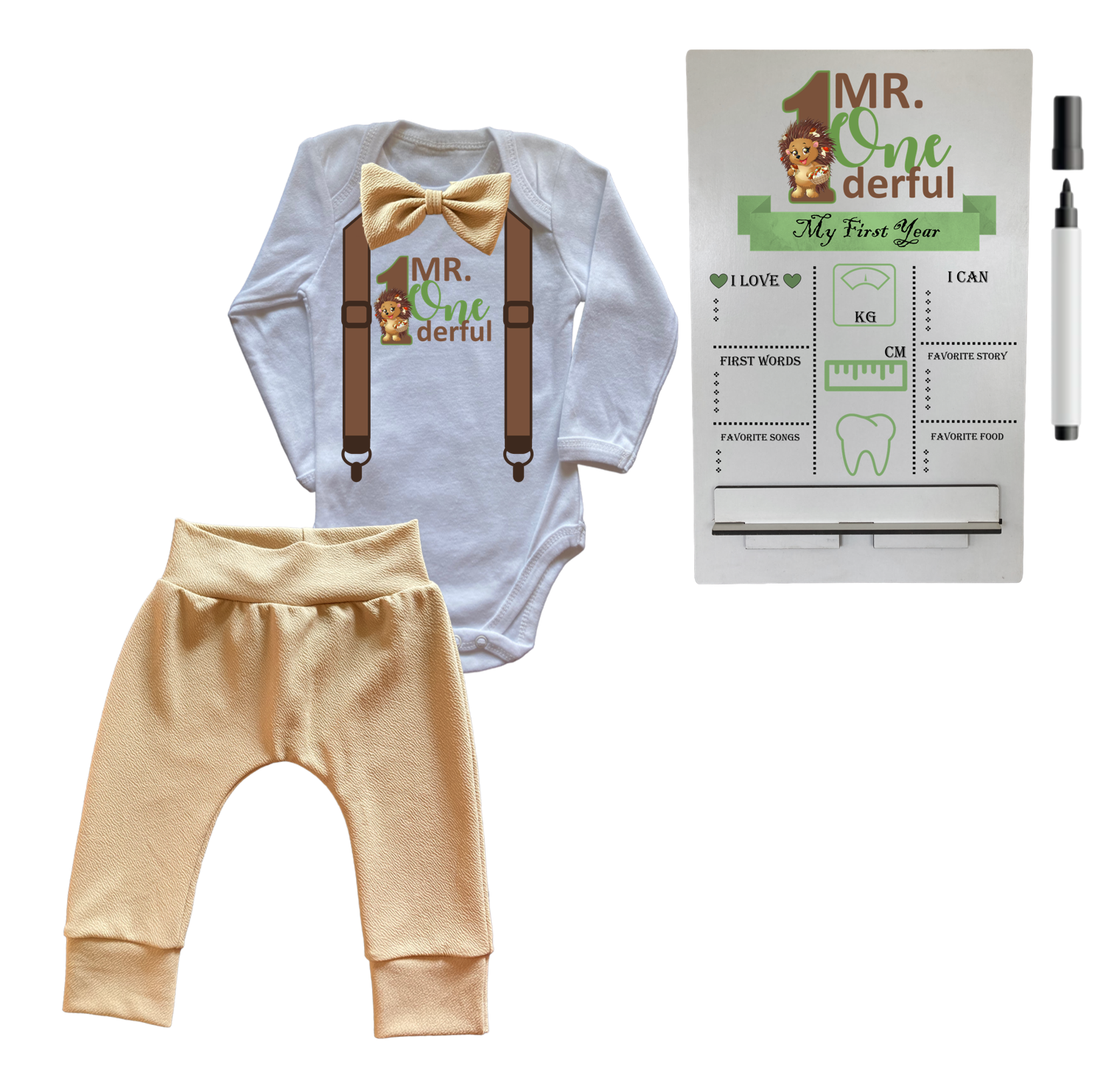 1st Birthday | Long sleeve pants & Bowtie vest | Milestone Sign | Stone | Mr One’derful