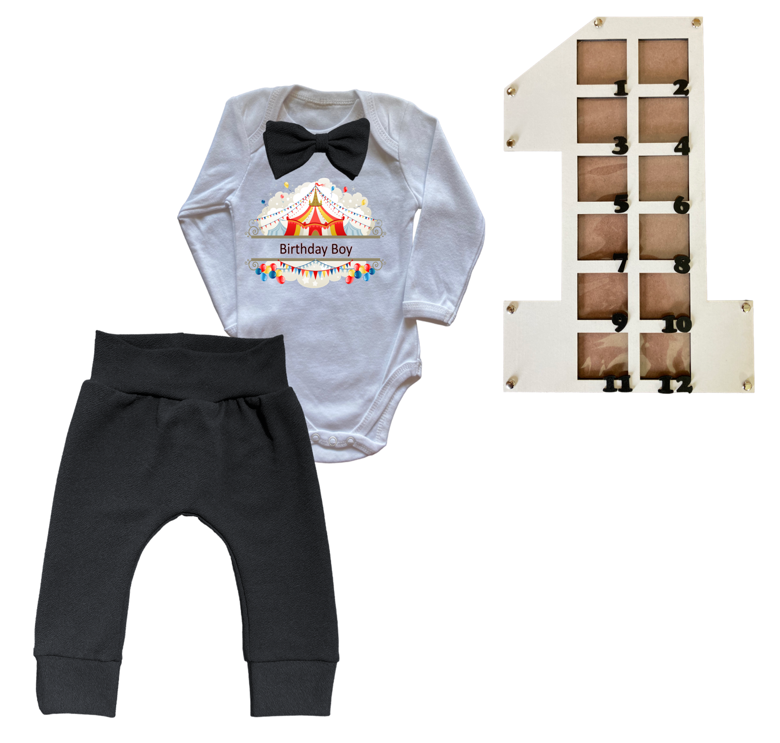 1st Birthday | Long sleeve pants & Bowtie vest | Photo Frame | Black | Carnival Carousel