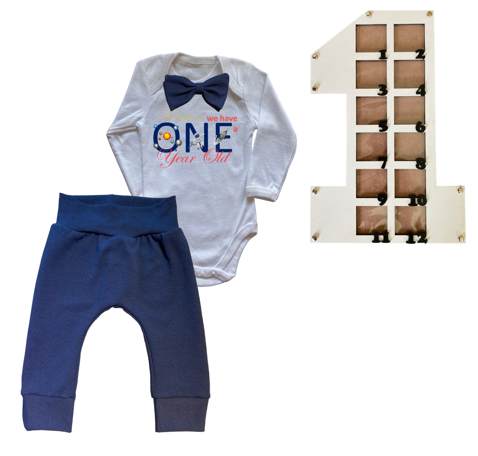 1st Birthday | Long sleeve pants & Bowtie vest | Photo Frame | Navy | Houston, we have a one year old