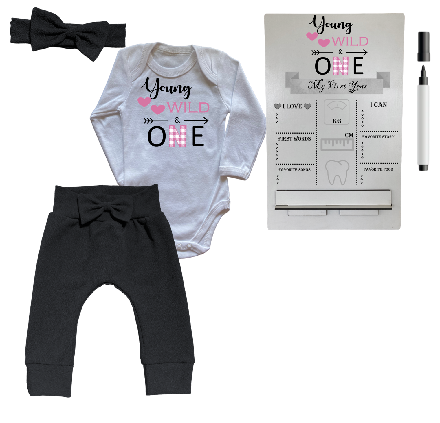 1st Birthday | Long sleeve pants, Vest & Headband | Milestone Sign | Black | Young, Wild & One