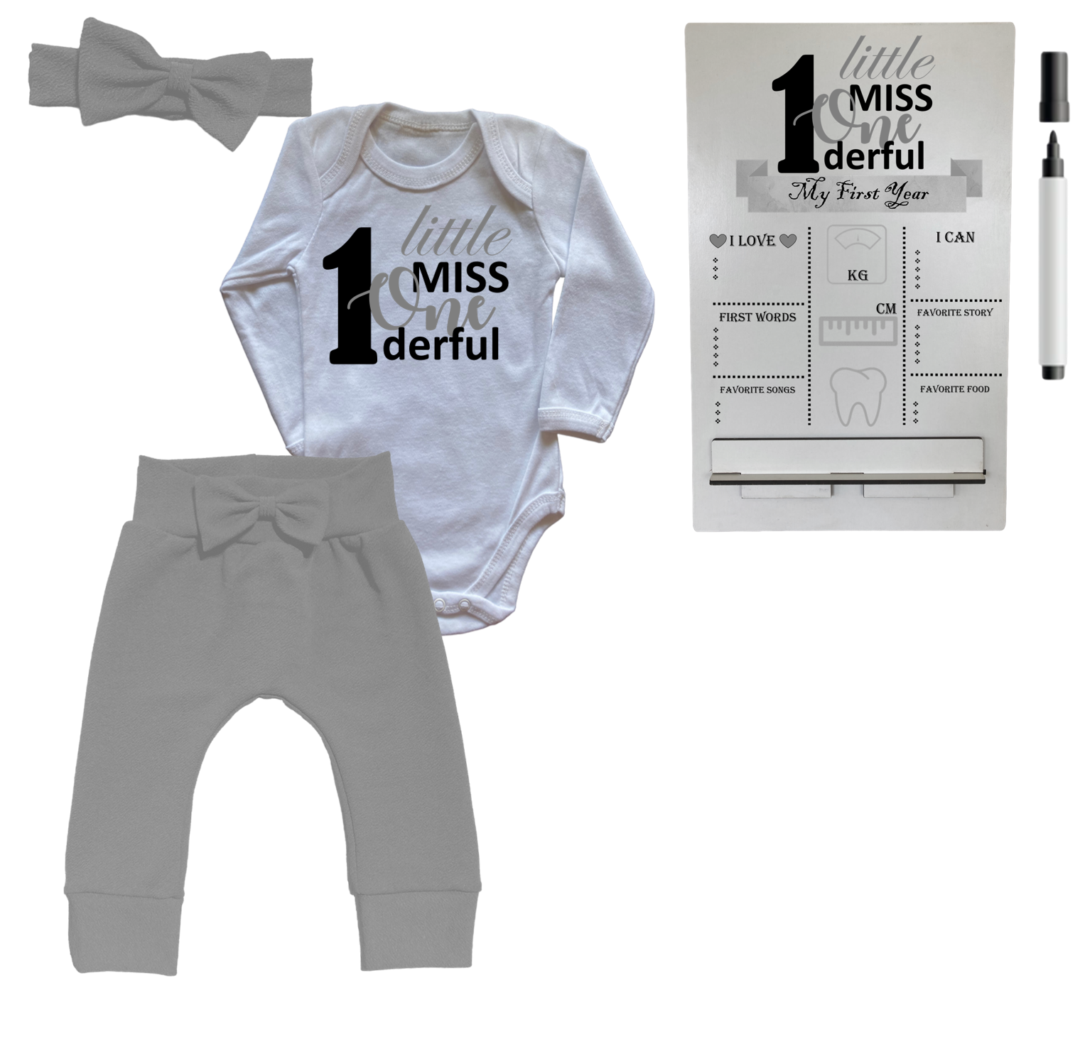1st Birthday | Long sleeve pants, Vest & Headband | Milestone Sign | Grey | Little Miss 1’derful