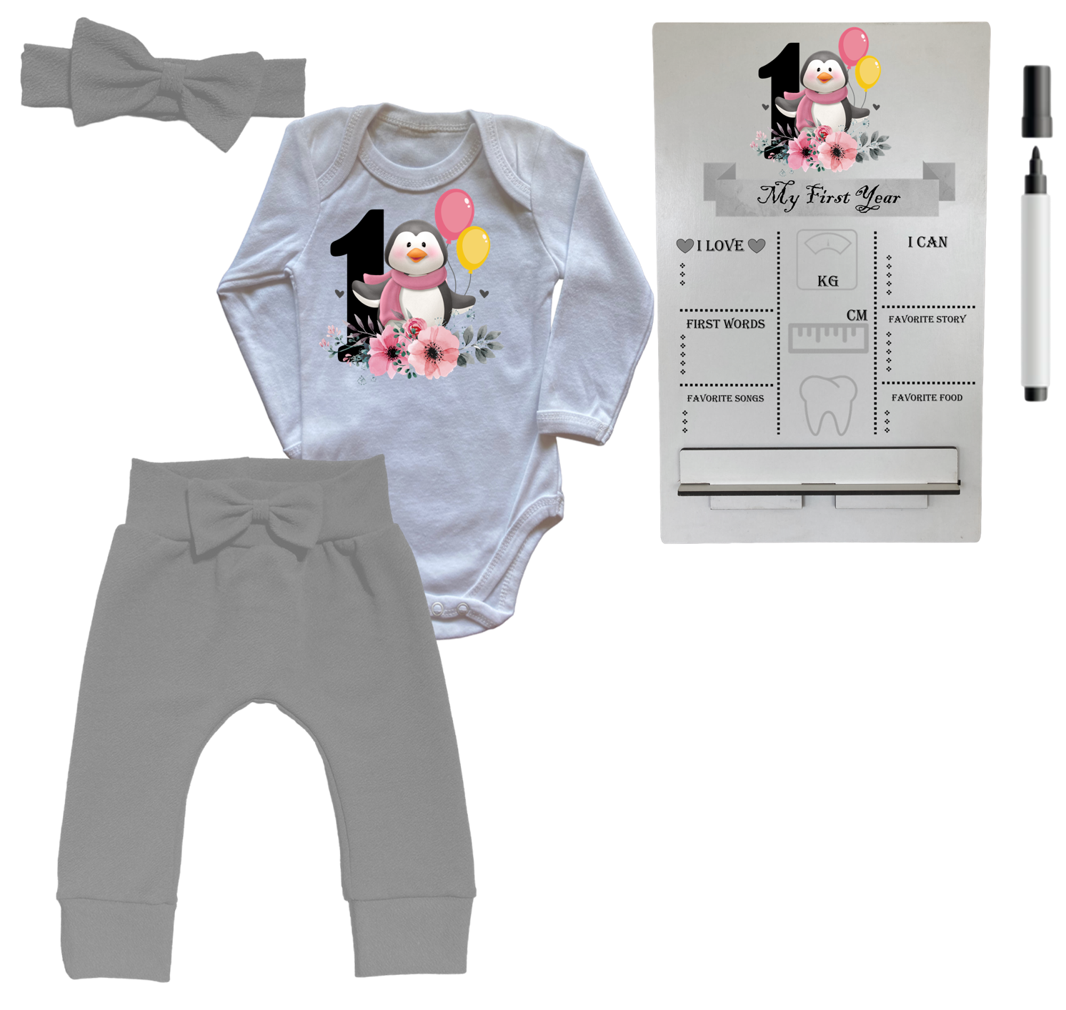 1st Birthday | Long sleeve pants, Vest & Headband | Milestone Sign | Grey | Penguin 1st