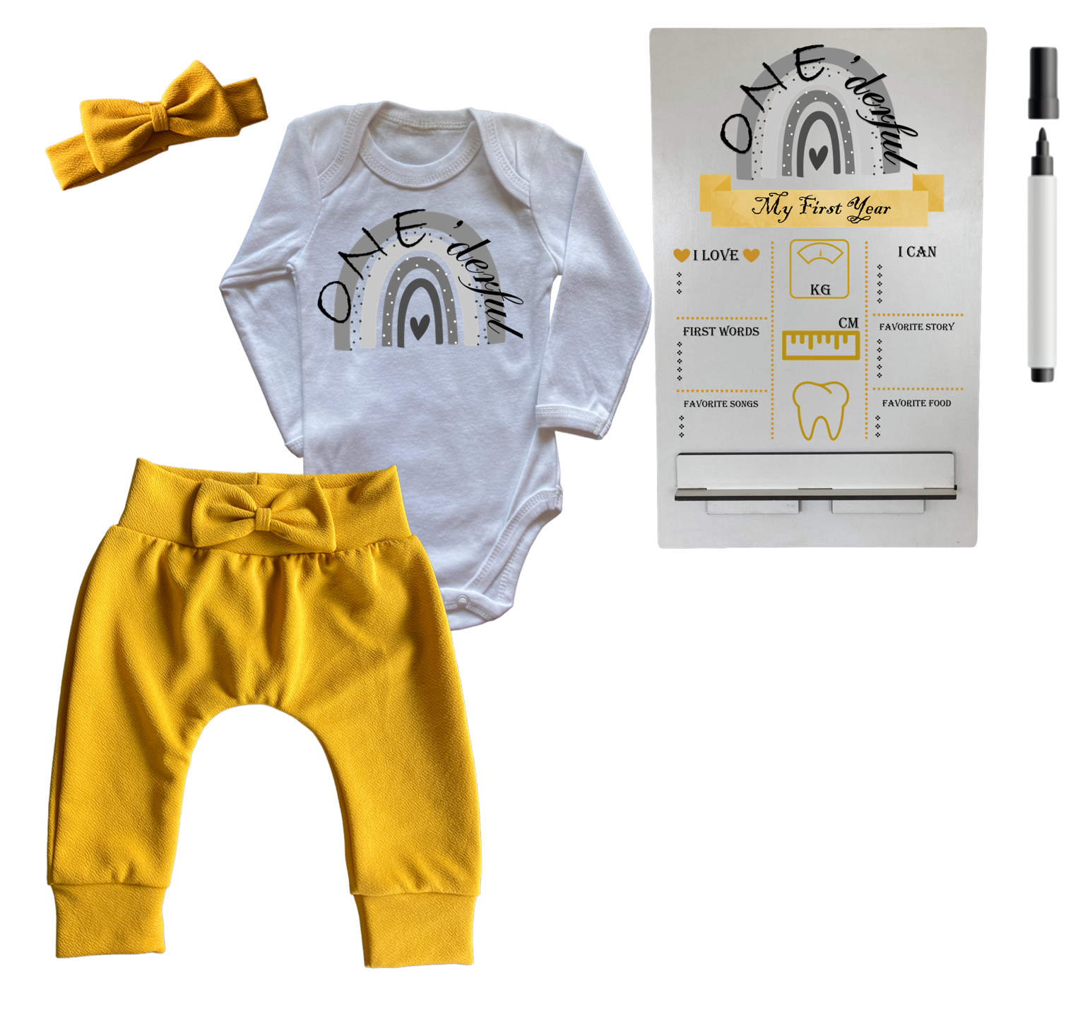 1st Birthday | Long sleeve pants, Vest & Headband | Milestone Sign | Mustard | Rainbow One’derful