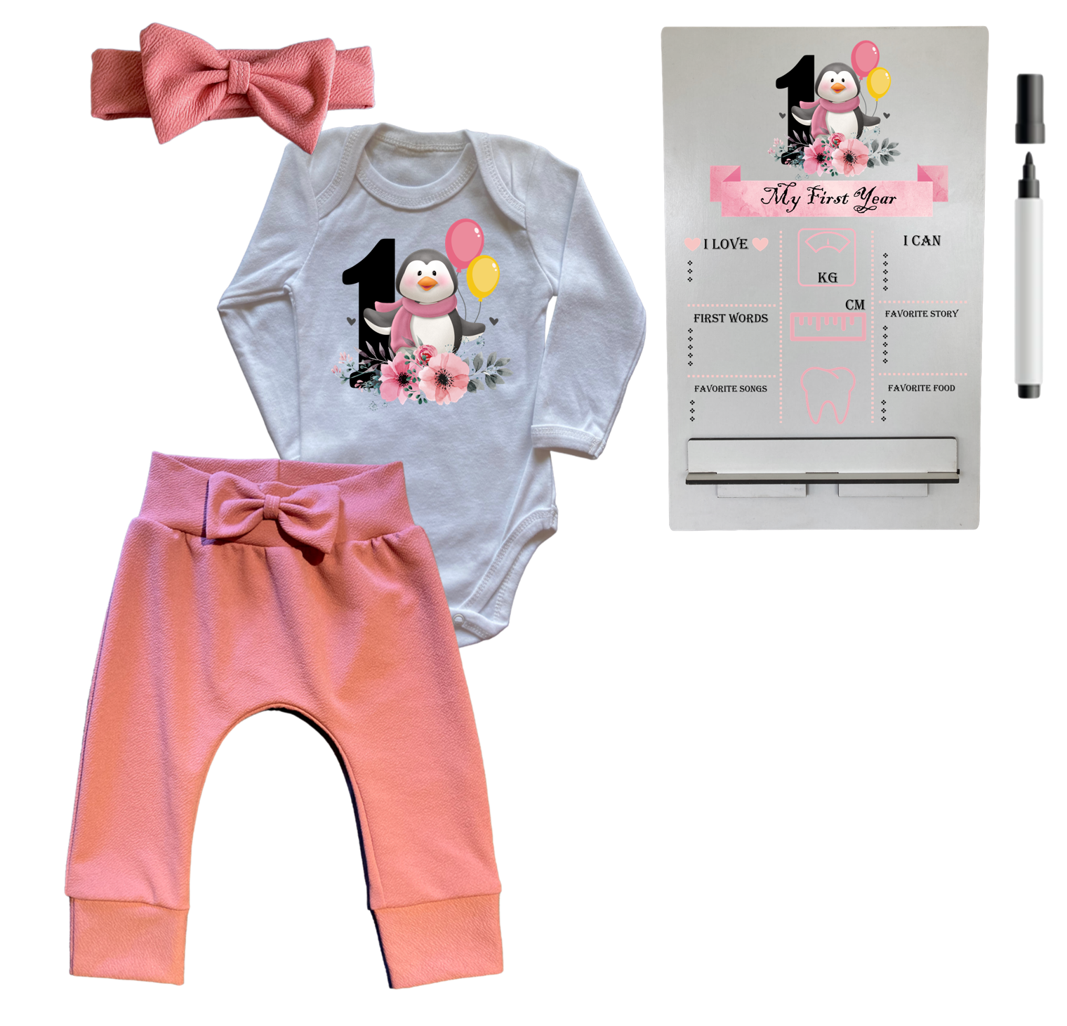 1st Birthday | Long sleeve pants, Vest & Headband | Milestone Sign | Pink | Penguin 1st
