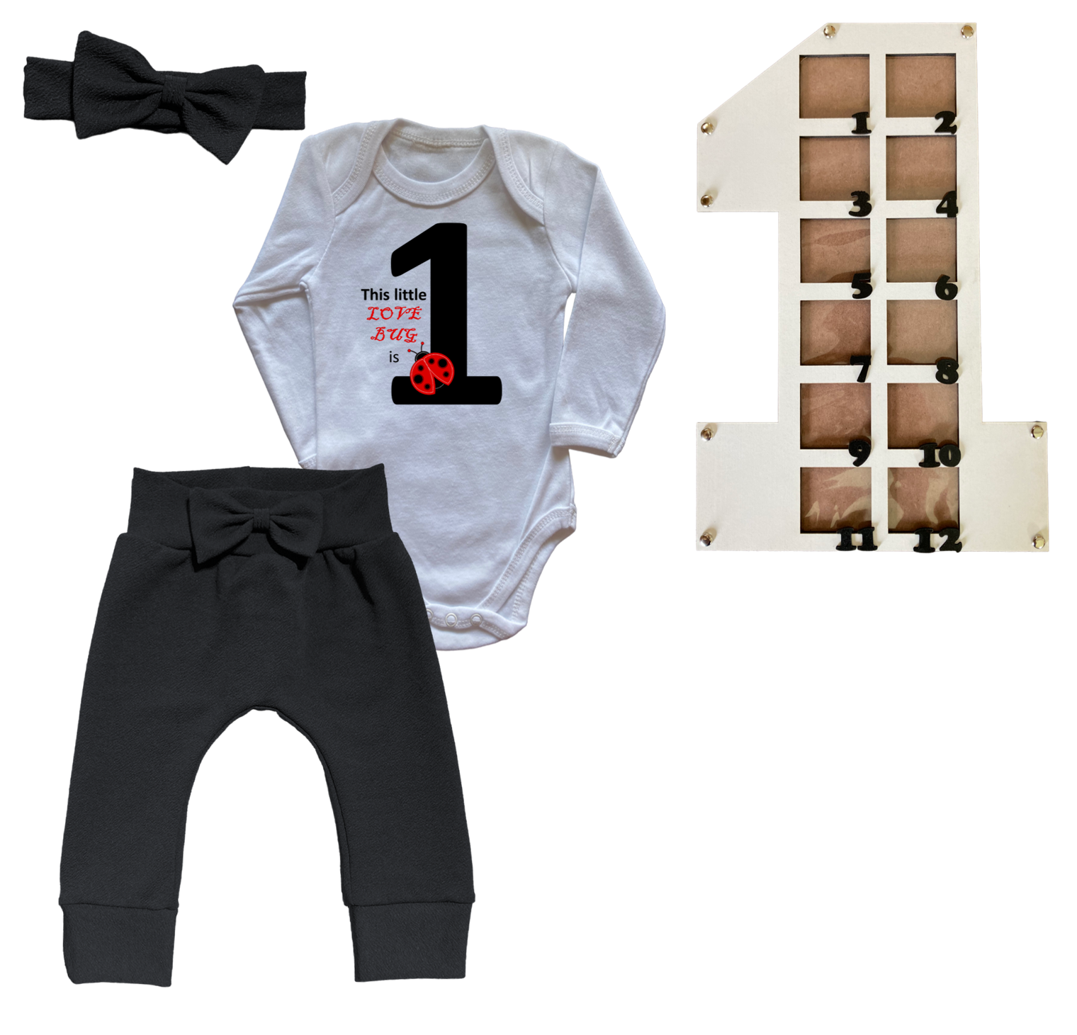 1st Birthday | Long sleeve pants, Vest & Headband | Photo Frame | Black | Little Love Bug