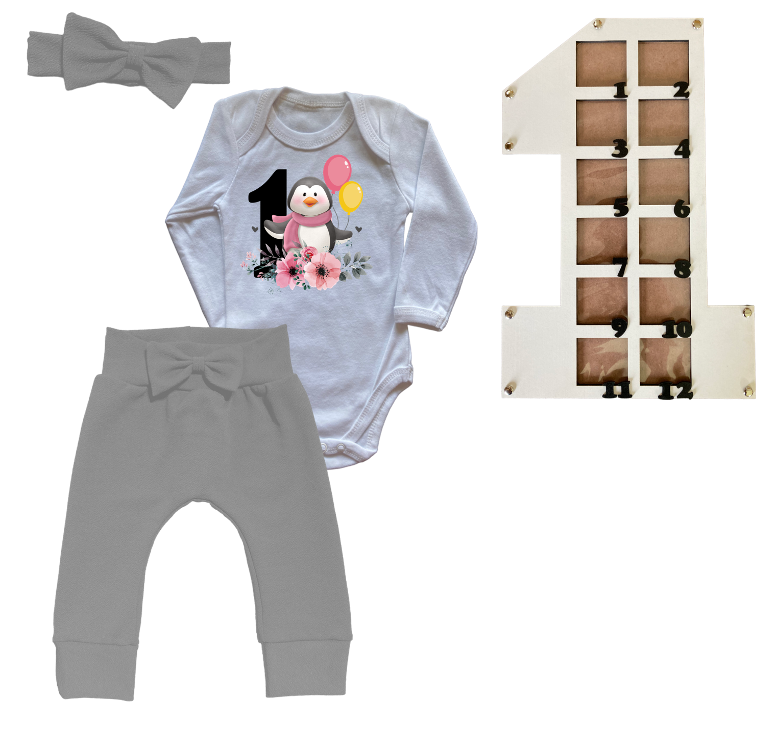 1st Birthday | Long sleeve pants, Vest & Headband | Photo Frame | Grey | Penguin 1st
