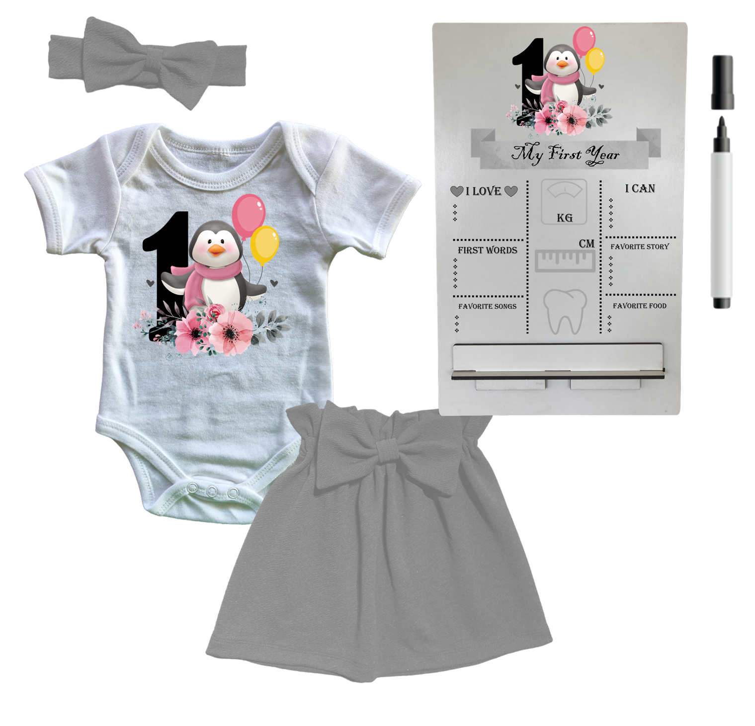 1st Birthday | Skirt, vest & Headband | Milestone sign | Grey | Penguin 1st