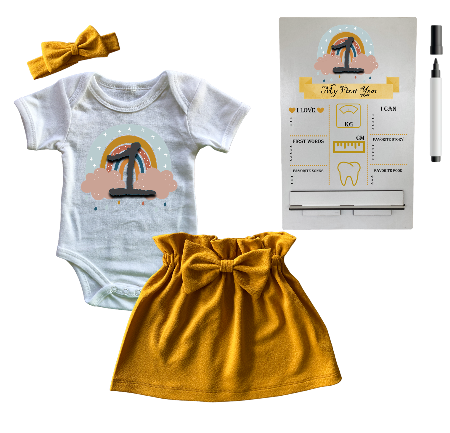 1st Birthday | Skirt, vest & Headband | Milestone sign | Mustard | Rainbow Colorful 1