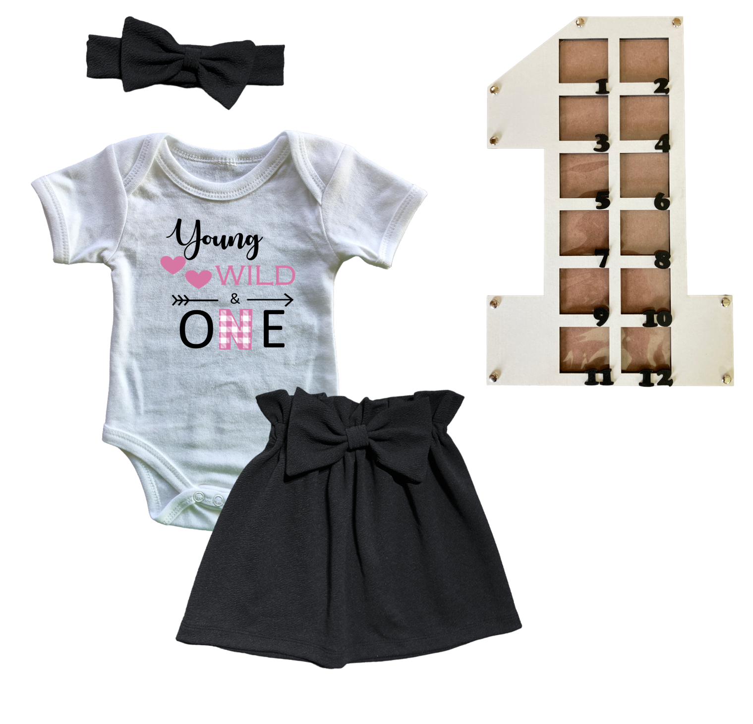 1st Birthday | Skirt, vest & Headband | Photo Frame | Black | Young, Wild & One
