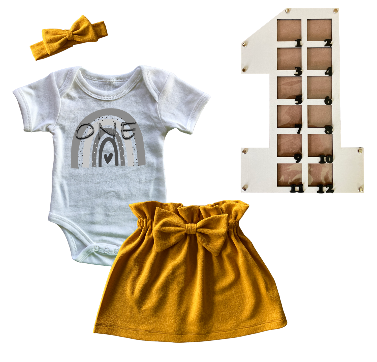 1st Birthday | Skirt, vest & Headband | Photo Frame | Mustard | Rainbow One