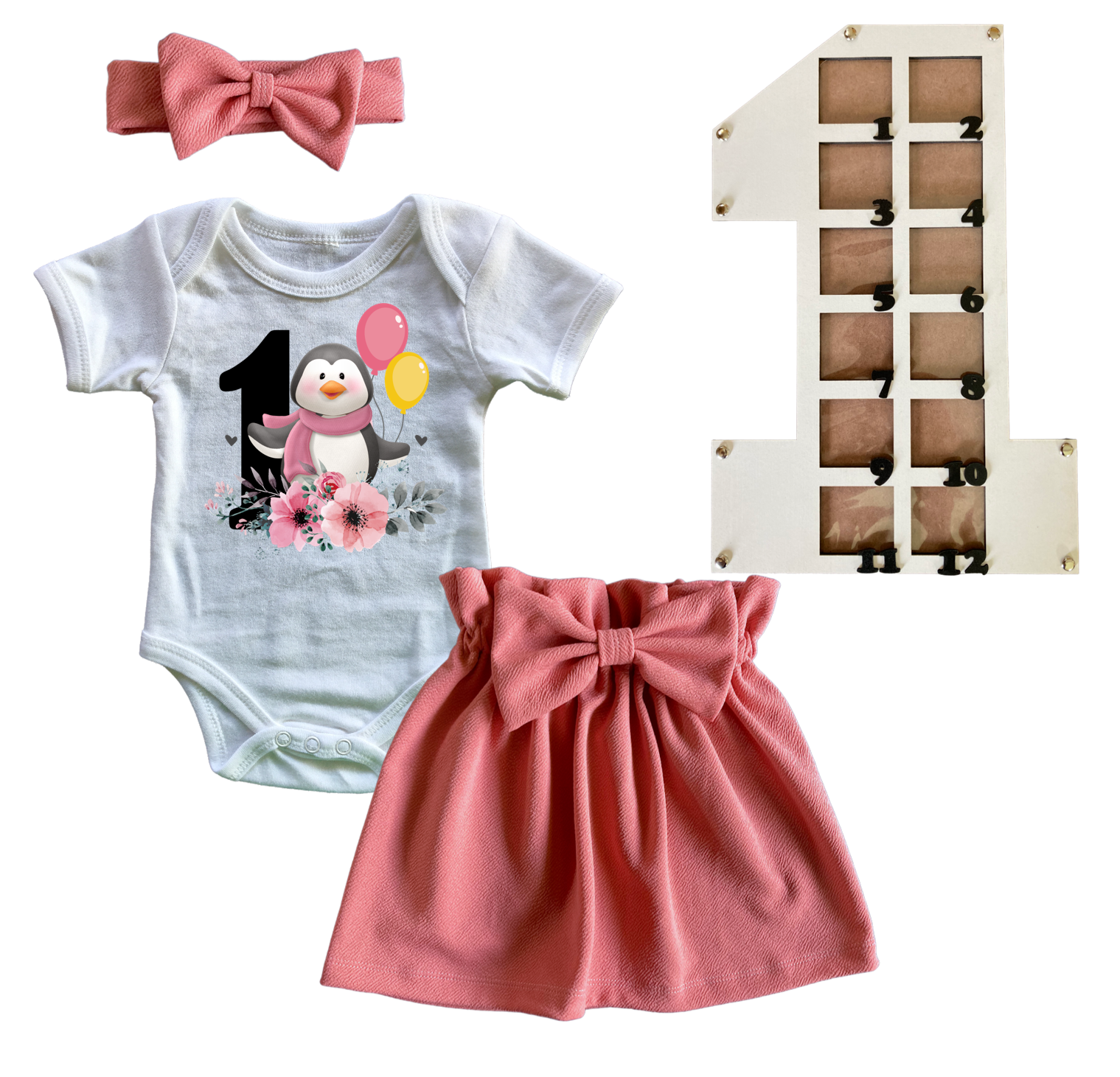 1st Birthday | Skirt, vest & Headband | Photo Frame | Pink | Penguin 1st