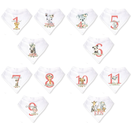 Featuring charming animal designs in soft, gender-neutral colours, these bibs are perfect for celebrating each milestone from 1 month to 12 months or look out for our smaller bundles, giving you the option to buy the upcoming 3 months and not all at once..