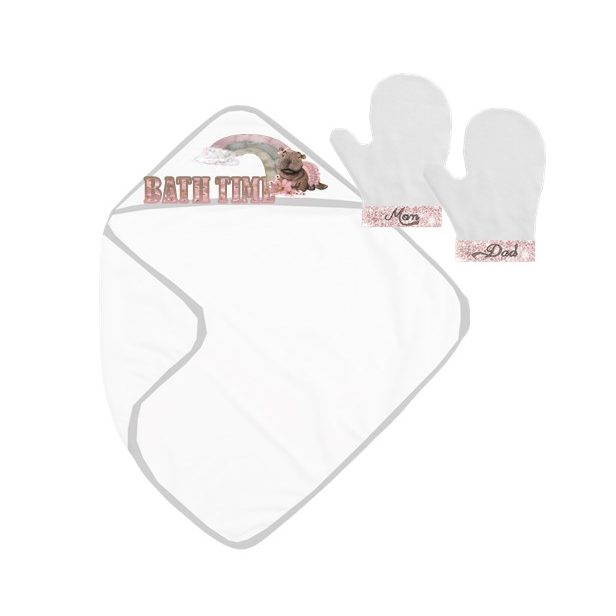 This babyshower gift set includes a hooded baby towel with a mom and dad cloth glove, this helps any new parent to make the bath process much easier by giving them more control by not having to hold a cloth and loose grip on their newborn baby.