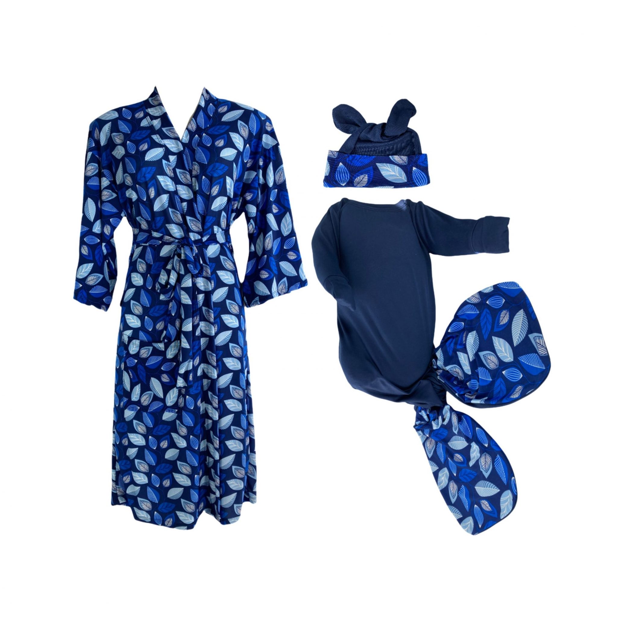 For Mom, there is a comfortable robe with an oversized pocket that can fit a cell phone. The robe can also act as maternity pyjamas, maternity gown, maternity robe for the hospital, hospital gown for labour and delivery, maternity pyjamas, or postpartum pyjamas.
