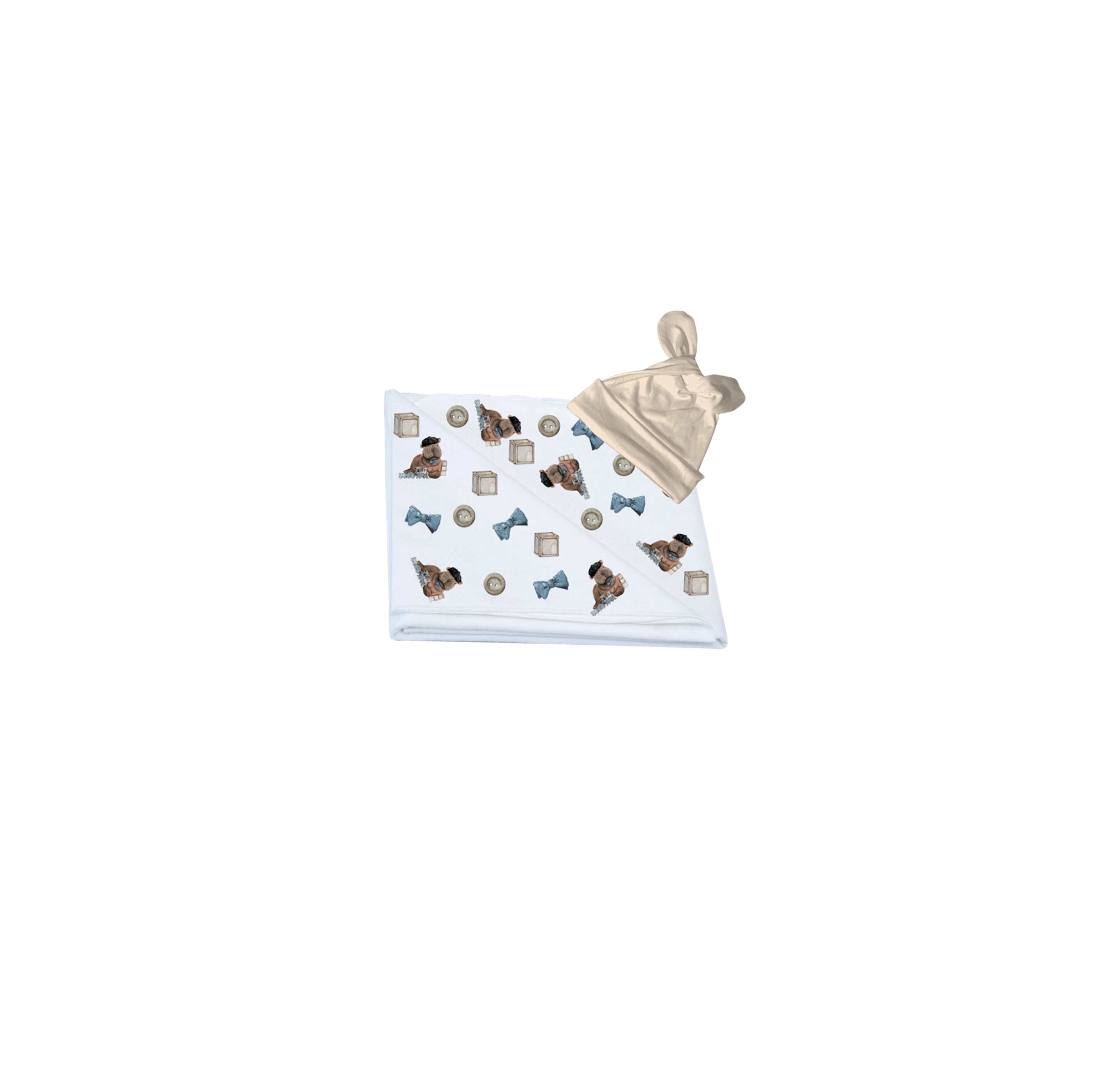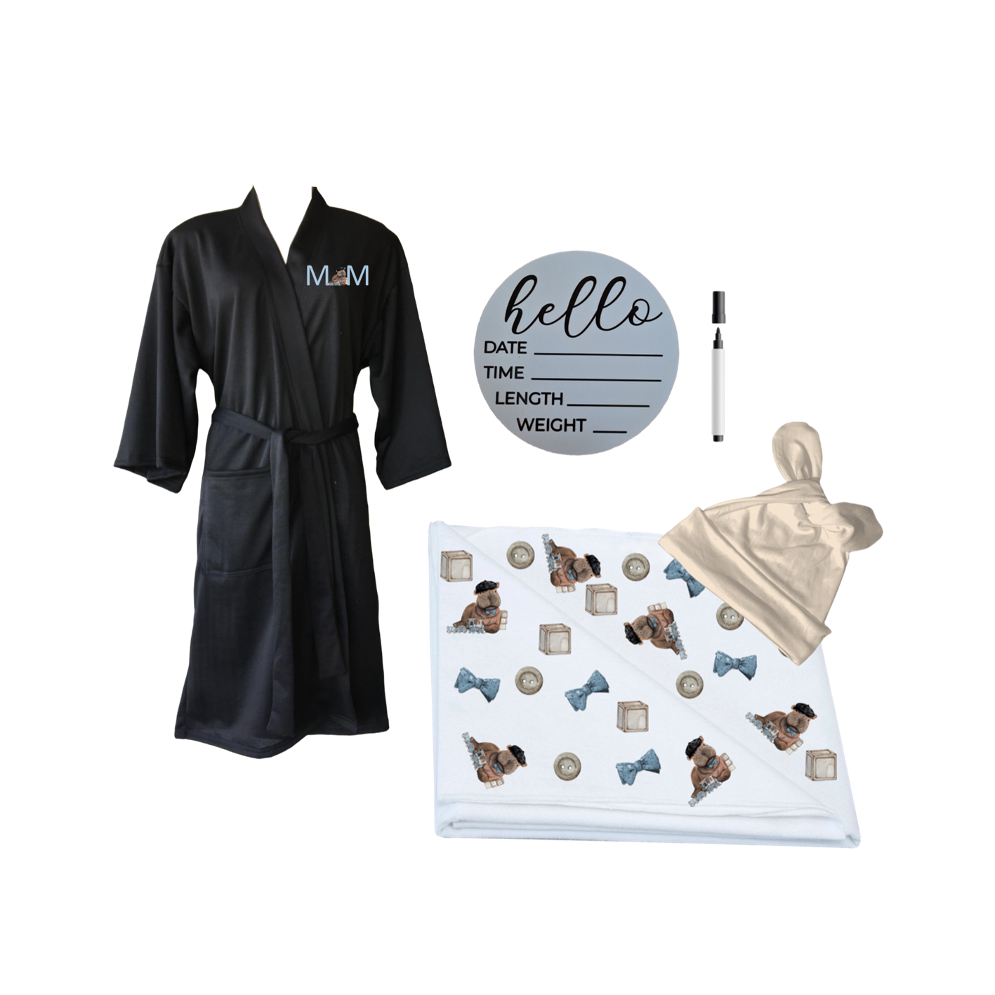 Mom & Me Set | Printed Gown, Swaddle & Milestone Board | Blue Hippo