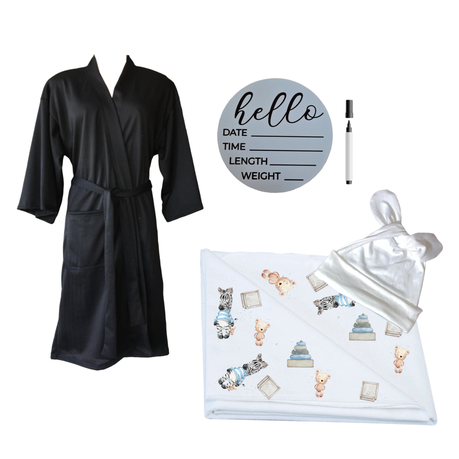 Mom & Me Hospital Set |Winter Gown, Swaddle & Birth Announcement Board|Blue Zebra