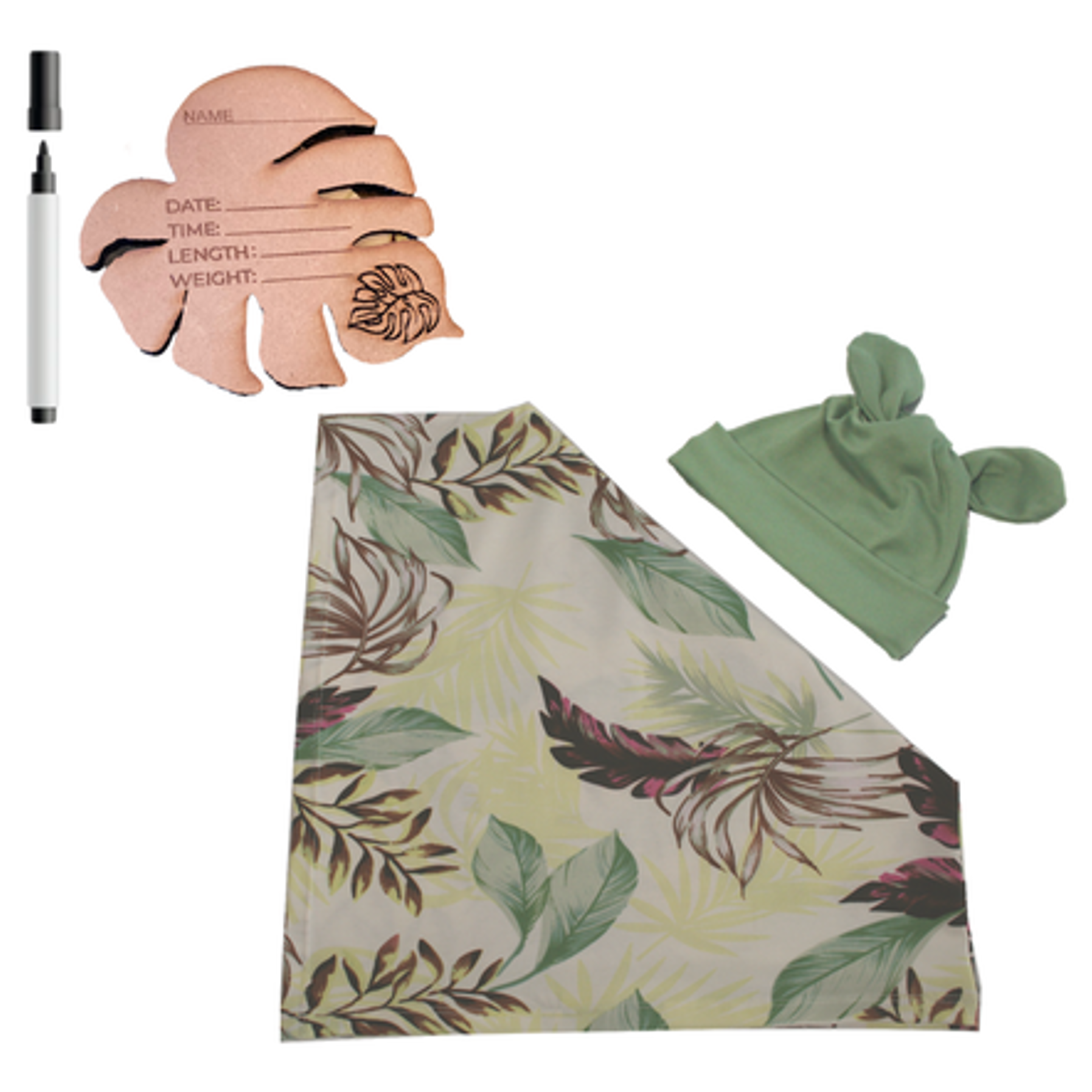 Swaddle, Newborn Beanie & Birth Announcement | Green Leaves